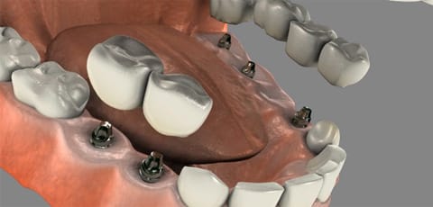 In cases where multiple teeth are missing or have been extracted, multiple implants can be used to bring back your smile. The implants are placed into the jawbone and are given time to heal. After the bone has healed around the implants, an abutment is attached to the implant which then allows for a crown or bridge to be placed right on the implant. These new teeth will look and act just like natural teeth.